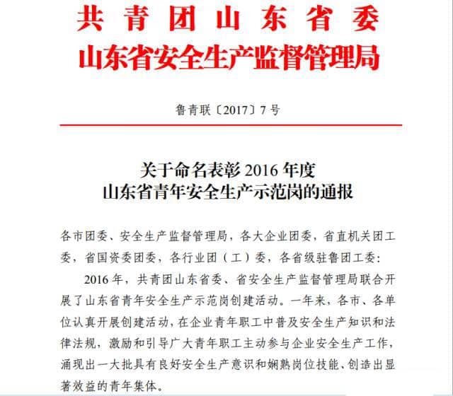 为激励引导全省广大青年职工强化安全生产意识,提高安全生产技能,参与安全生产管理,2016年共青团山东省委、山东省安全生产监督管理局优发国际开展了山东省青年安全生产示范岗创建活动。优发国际新产品班组荣获2016年度“山东省青年安全生产示范岗”
